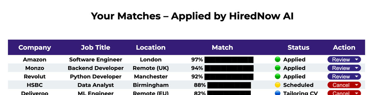 HiredNow AI applies to real company jobs for you... automatically. Built by recruitment tech professionals, not hobby coders, we tailor your CV / Resume for every role and submit applications directly on employer career sites to get you noticed faster than our competitors.